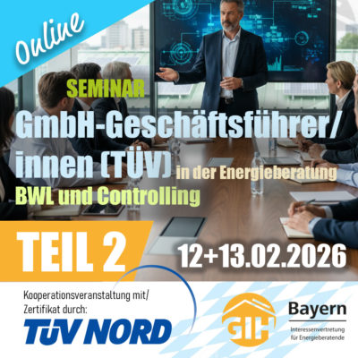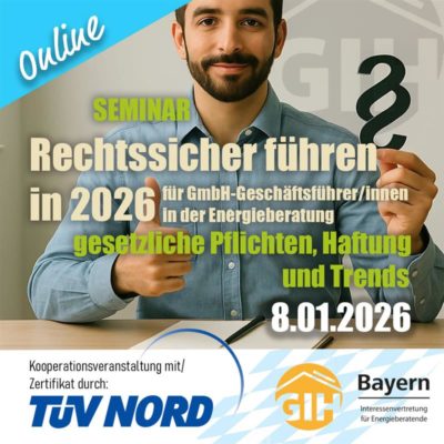 Der GIH Bayern präsentiert ein neues, praxisnahes Seminarangebot speziell für Geschäftsführer/innen in der Energieberaterbranche. Die Veranstaltungen vermitteln rechtliche Sicherheit, wirtschaftliche Souveränität und stärken die Führungskompetenz – alles zugeschnitten auf die besonderen Anforderungen der Branche. Die Seminarreihe umfasst Themen wie Zeitmanagement für Führungskräfte sowie rechtssicheres Führen im Jahr 2026.